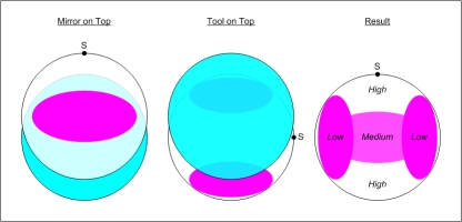 1 After about three hours of work, the figure has developed as in the above (bad) image. The center portion horizontally (previously long RoC direction) has now equal RoC as the vertically (previously 'S' RoC direction). Where the vertical direction shows pretty much spherical when the mirror is 90° rotated, the horizontal direction has high areas near the edge. One could say that the action has overshot its goal, and some reverting ToT strokes are in order to bring the high parts down. Then smoothing and correction of the turned edge... |