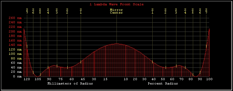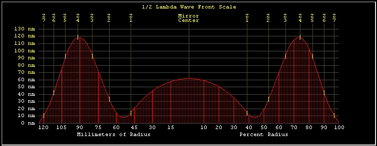 -24- After 1 minute of 30% MOT with no weight followed by 2 minutes 15% TOT, the Strehl measures 0.97. Based on the surface error graph, a short 15% overhang MOT session is needed to get the edge up a bit, but I'm not so sure about the Foucault readings. It is now definitely time to do some more accurate measurements, both Foucault and Bath, in a more stable environment. Nice job for tomorrow.