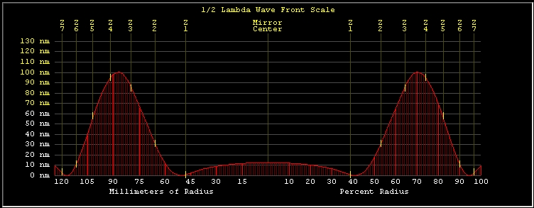 The OpenFringe analysis shows about the same as the Foucault test (at best fit conic), which in itself is reassuring. The main observation is that the central region is still quite high, which asks for a few minutes of wider MOT strokes still. Then the outer zones are ramping up, but this should really be reconsidered after the center has been worked down. One other observation from the OF analysis is that the edge seems better than measured at the KE.